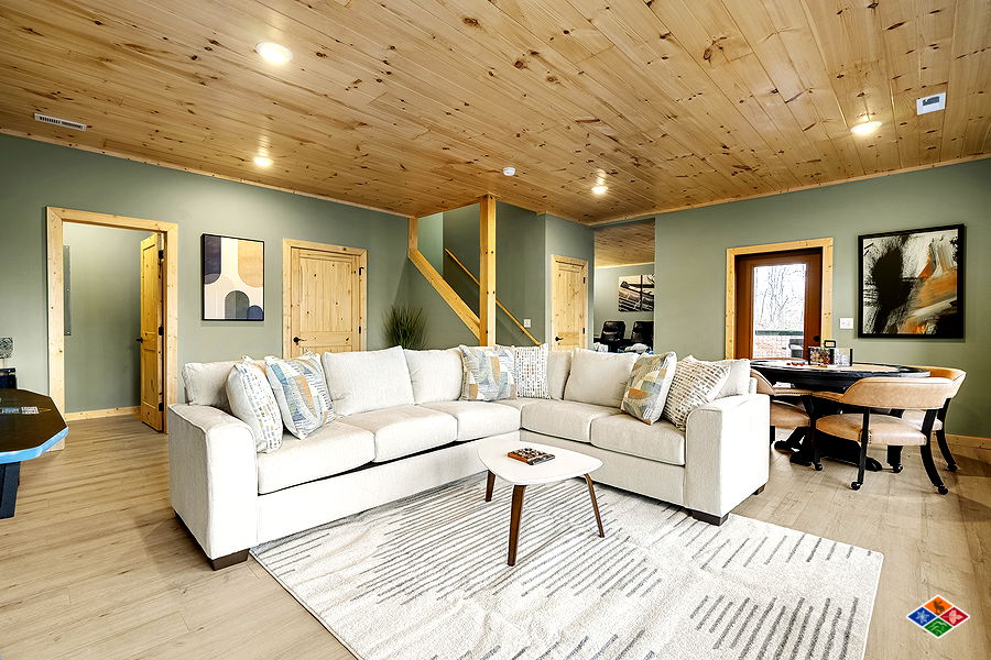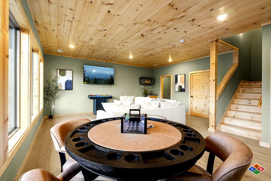 Social Hub: The lower level features a sleeper sectional and a poker/game table, creating the perfect "kids' zone" or late-night hangout spot.