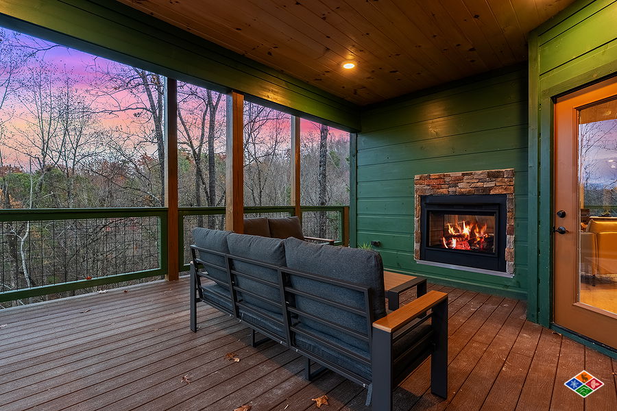 Dual-Sided Fireplace: A spectacular gas log fireplace serves both the great room and the covered outdoor deck.