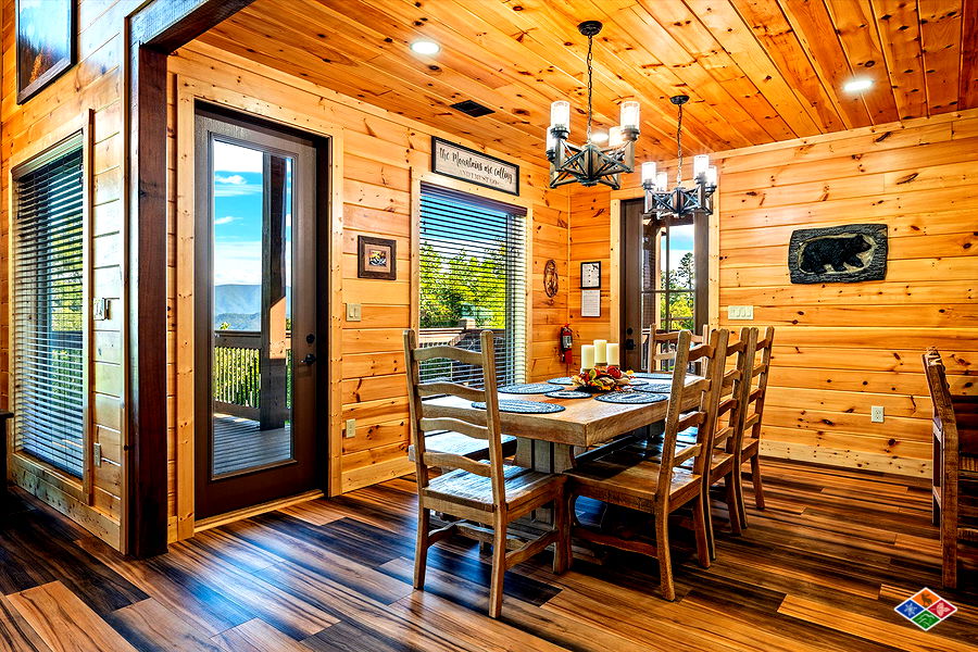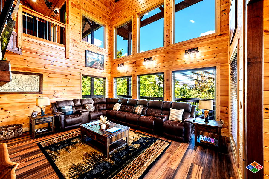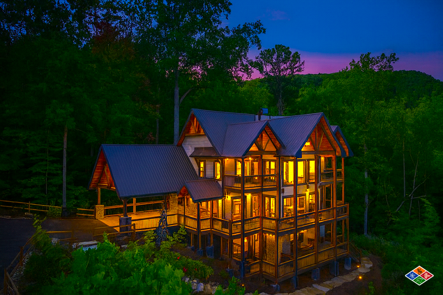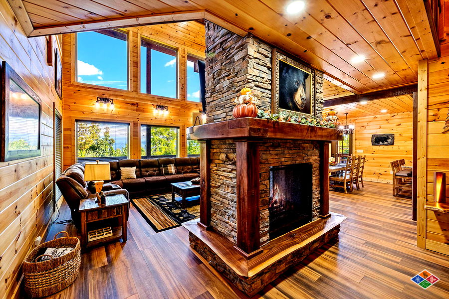 Enjoy a private heated indoor pool, hot tub, game room, outdoor living area with fireplace. Gather as a group in the private theater room with 9 foot screen. Prepare in cabin meals in the high end chefs kitchen with dining area. Retire to one of the ULTRA luxury king suites with spa bath - 2 of which have fireplaces and vessel soaking tub. The kids will enjoy the bunk room with 2 sets of triple bunks (sleeps 6 kids).
