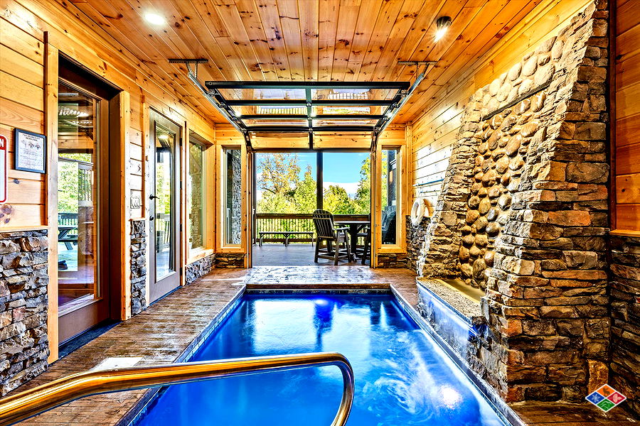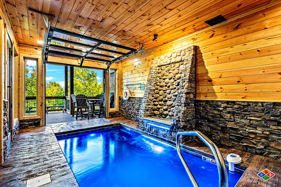 Indoor Heated Pool With Waterfall and Garage Door to Open to the Outdoors